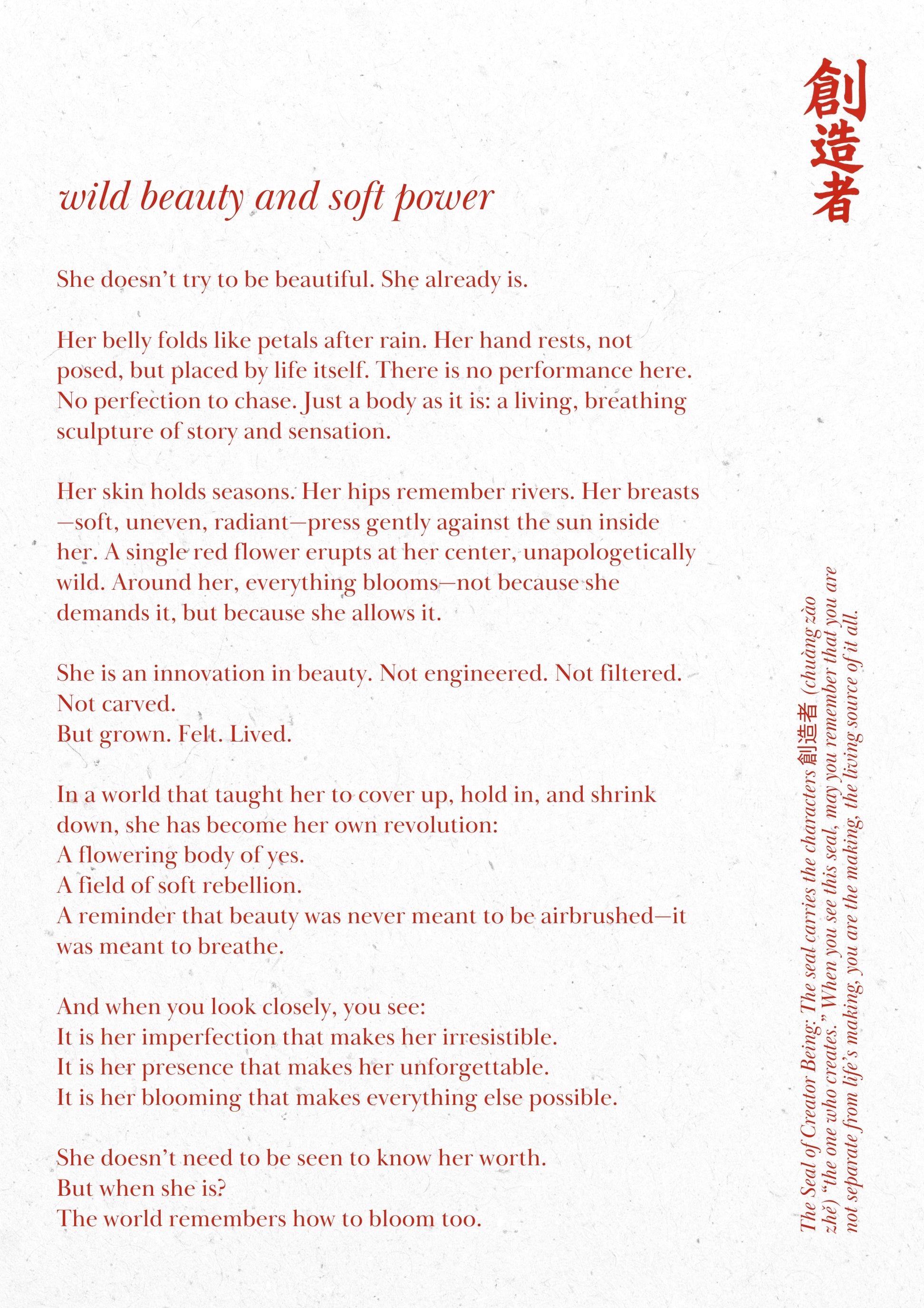Where light touches skin, a thousand flowers bloom. This piece speaks to the radiant aliveness of the body — a sacred, sensual garden of Source.