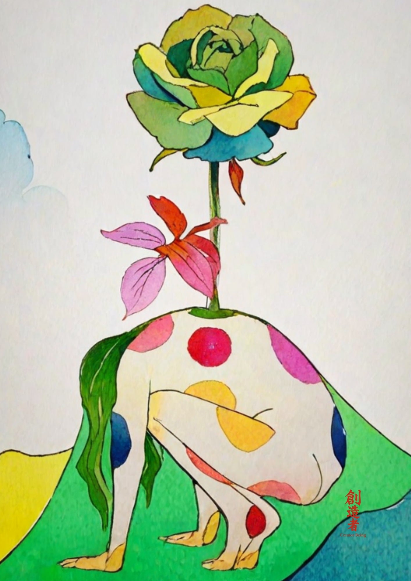 This being kneels not in surrender, but in fertile readiness. From her spine, the rose of becoming blooms — rooted in Earth, crowned by sky.